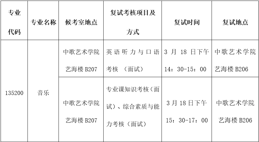 专业课知识考核、综合素质与能力考核:采用面试形式进行,重点考查考生的演唱技巧、语言表达能力、作品体式与艺术特色的分析能力,以及对道德品质、心理素质、综合素质等能力的考核。考核最终分数为去掉1个最高分和1个最低分后的其他成绩平均分(百分制,且精确到小数点后两位)。