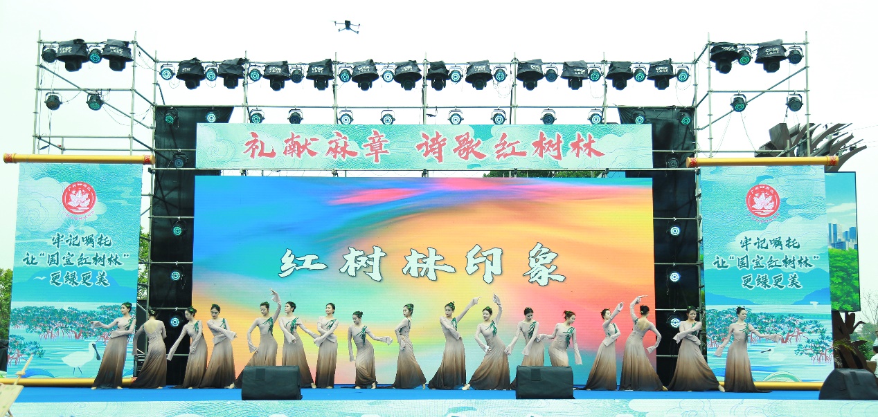 4月10日,由中共湛江市麻章区委宣传部、广州市白云区派驻湛江市麻章区对口帮扶协作工作组主办的“礼献麻章·诗歌红树林”诗歌节文艺活动在金牛岛红树林举行,由王珊教授指导、研究生李芷萱编导的舞剧《红树林印象》领衔艺术节文艺汇演。