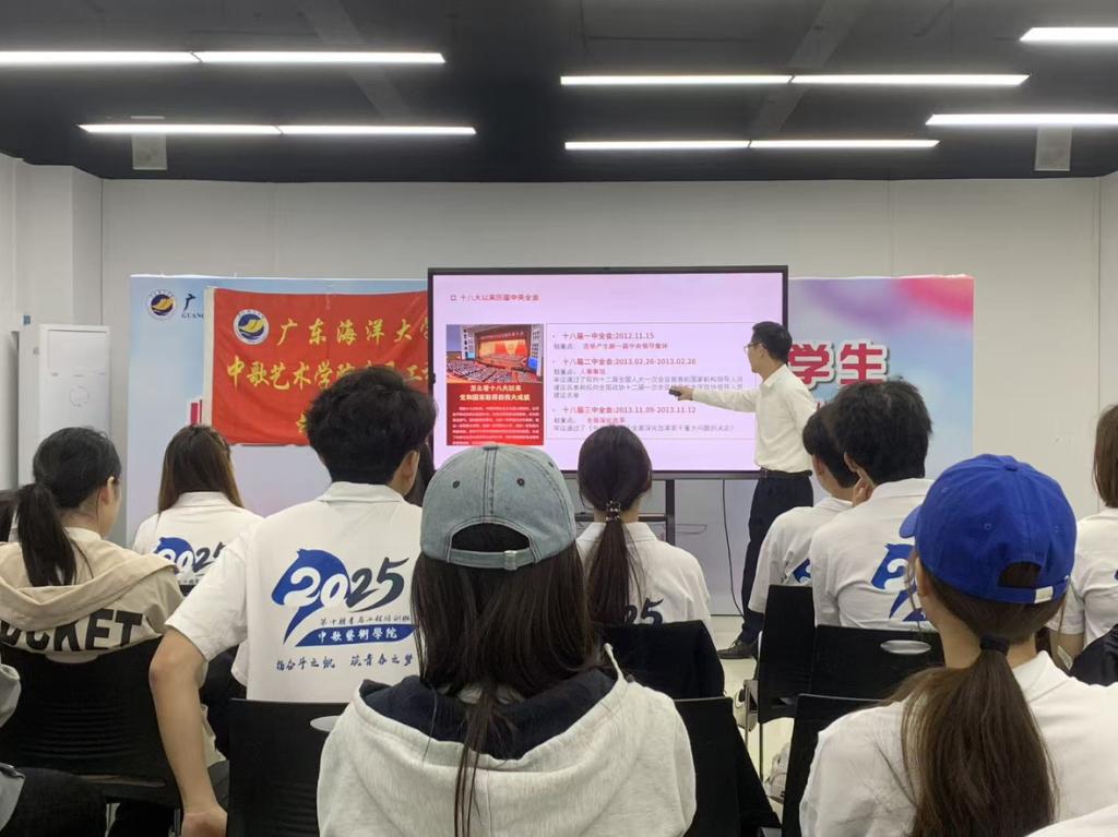 宣讲以“学习贯彻党的二十届四中全会精神——以艺术之力赋能高质量发展,谱写中国式现代化青春篇章”为主题,翟周围绕全会《建议》提出的“十五五”时期战略目标与重点任务,结合艺术专业特色,从“文艺工作者如何助力文化新质生产力发展”“青年学子怎样在文化强国建设中锚定坐标”两大维度展开解读。他通过“非遗传承与现代设计融合”“红色主题艺术创作”等鲜活案例,将“文化自信”“创新驱动”等抽象理论转化为可感知的实践路径,并通过互动问答引导学员思考“专业学习与国家需求的结合点”,现场反响热烈。